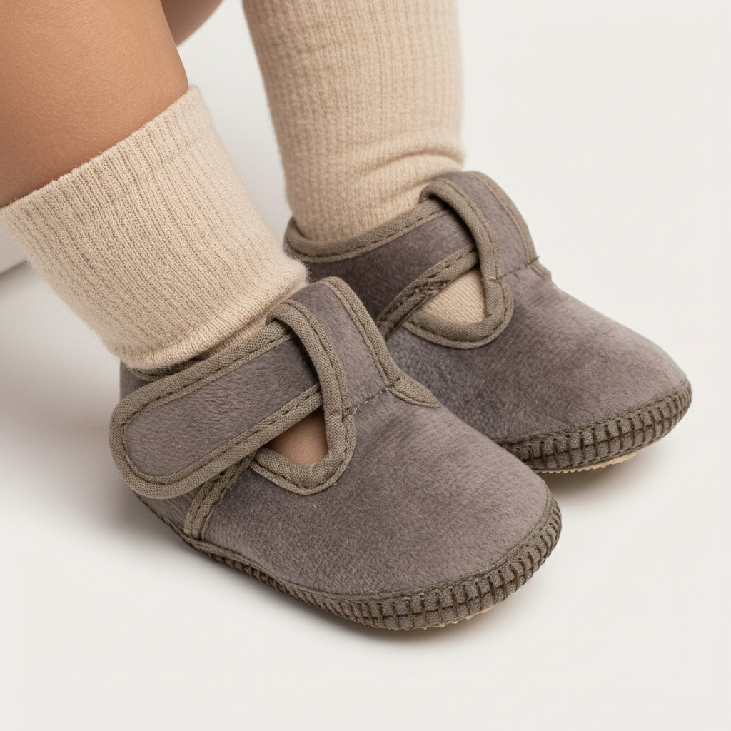 Guillermina clásica para bebes no caminantes. Exterior en «Pana Donn», interior de micropolar antipilling. Suelin de PVC antideslizante. Presentación en estuche con ventana acrílica. Calce tradicional.