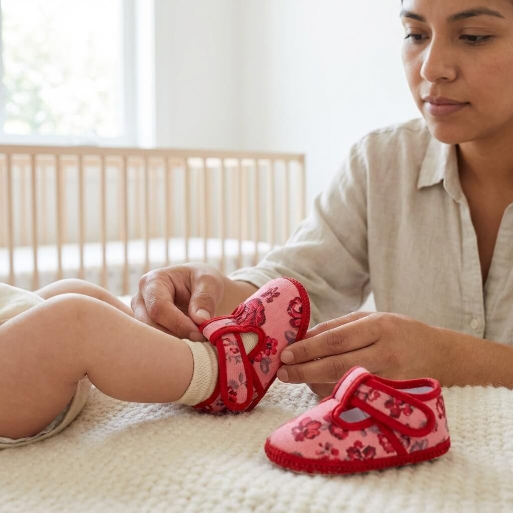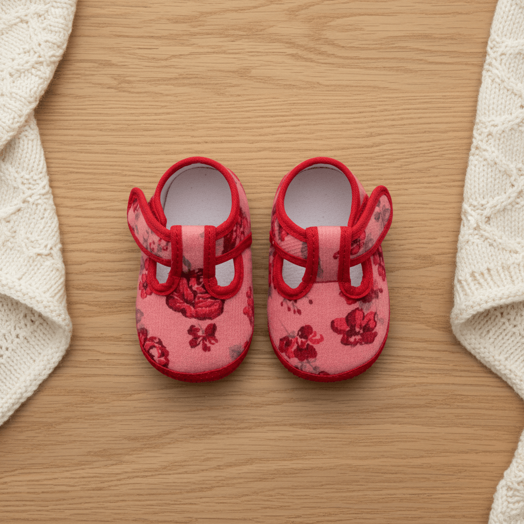 Guillermina clásica para beba no caminante, capellada corderina estampada. Forro/abrigo interno de micropolar antipilling.Suela de PVC antideslizante. Presentación en estuche con ventana acrílica.
