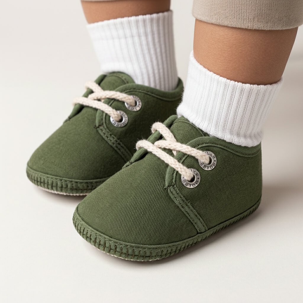 Zapatito clásico acordonado: exterior en gabardina lisa (Algodón), Estructura EVA FOAM que se adapta al pie conservando su forma sin comprometer la flexibilidad que el bebe necesita. Interior y plantilla de towell de algodón, suelín de PVC antideslizante.