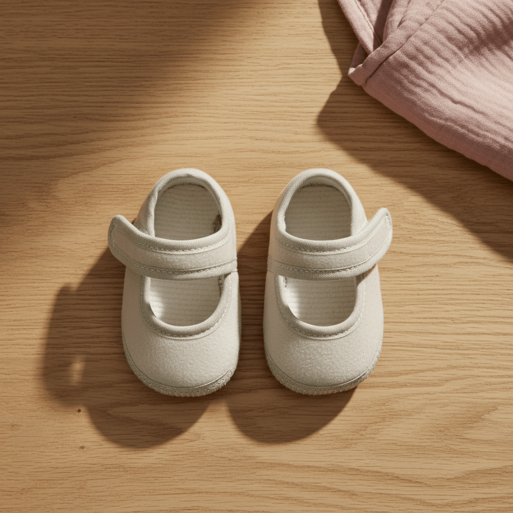 Guillermina pulsera para beba no caminante, exterior en «Pana Donn», forro interno de  micropolar antipilling. Suelin de PVC antideslizante. Presentación en estuche con ventana acrílica. Calce tradicional.