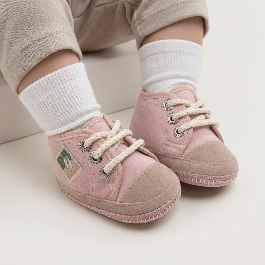 Zapatillita alta para bebés no caminantes. Exterior en Pana, con apliques de gamuzón , interior de micropolar antipilling y suelin de PVC antideslizante. Presentación en estuche con ventana acrílica. Calce tradicional.