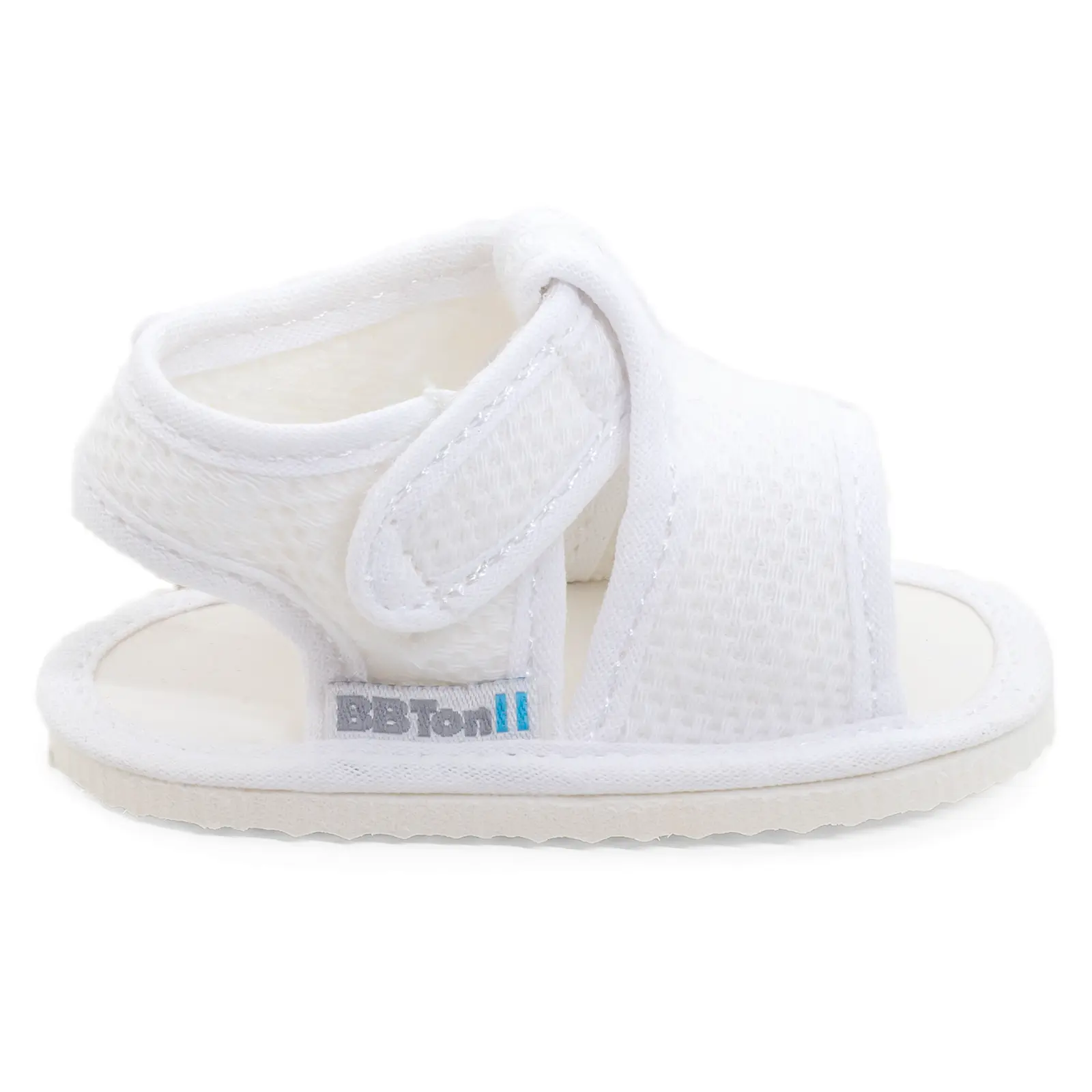 Sandalia con cierre de abrojo, exterior pique de algodón, interior towell y suela de goma EVA. Presentación en estuche con ventana acrílica.