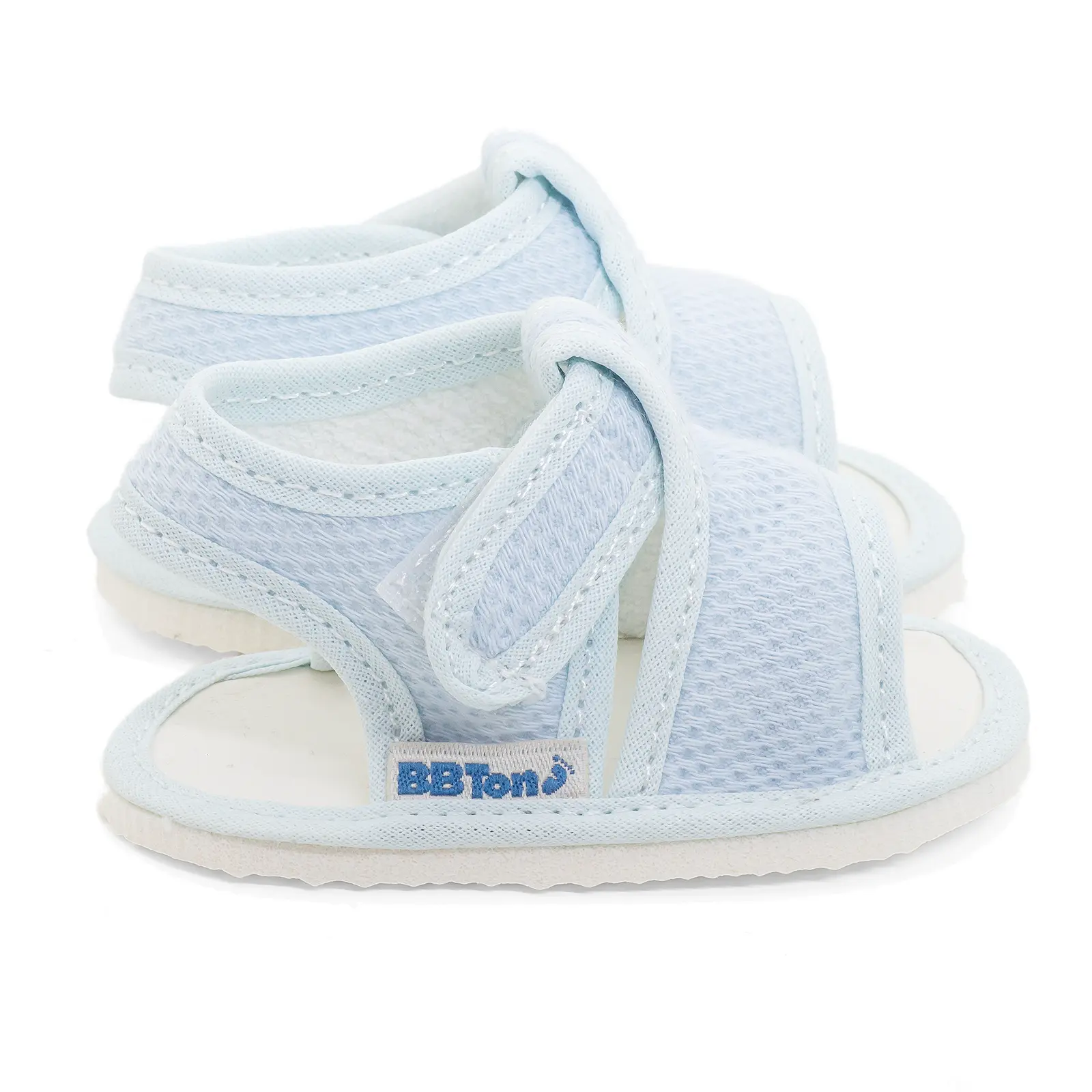 Sandalia con cierre de abrojo, exterior pique de algodón, interior towell y suela de goma EVA. Presentación en estuche con ventana acrílica.